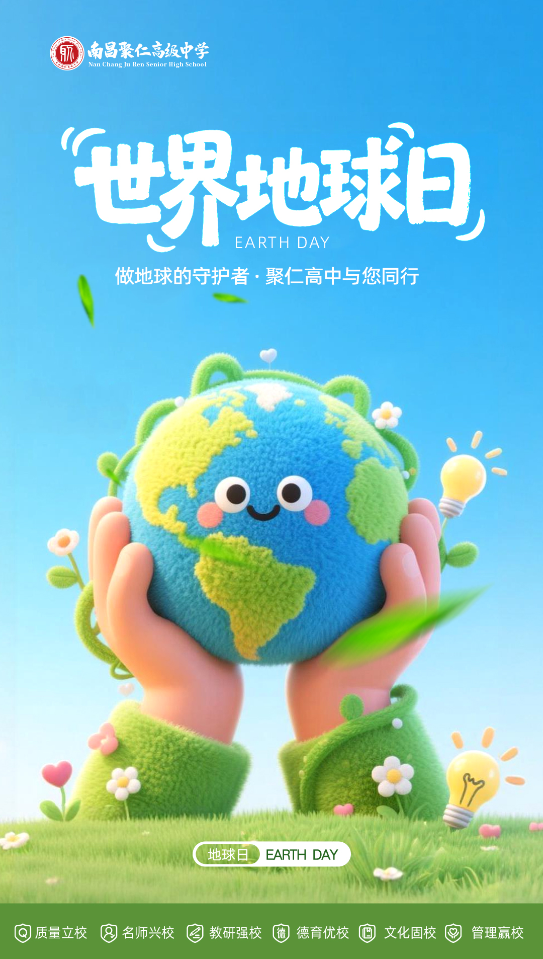 世界地球日——我们一起做地球的守护者 保护地球,不需要惊天动地的壮举。一个随手关灯的动作,一个自带水杯的习惯,一次垃圾分类的选择……聚仁高中邀你一起,做地球的守护者。