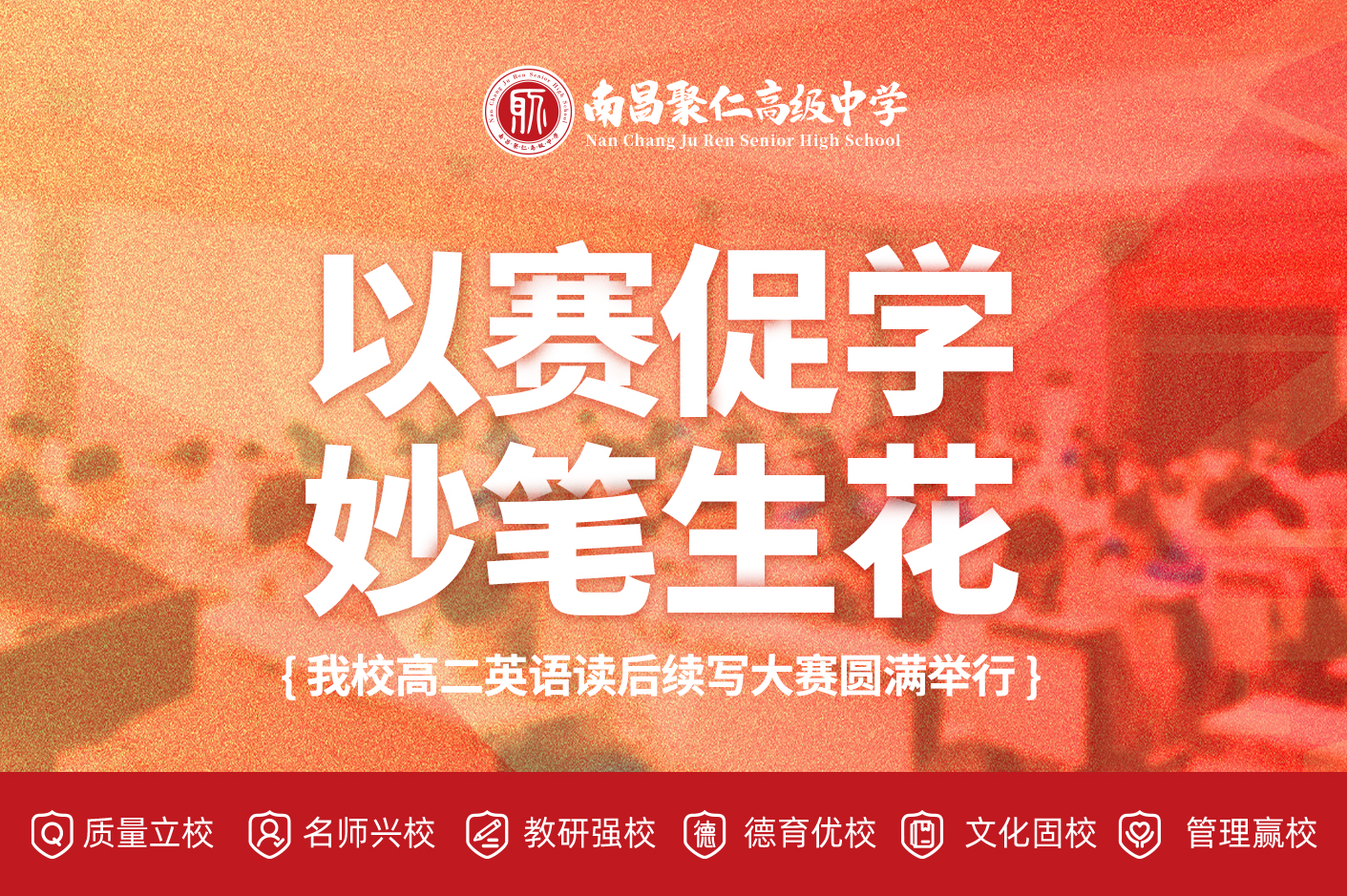 以赛促学,妙笔生花——我校高二英语读后续写大赛圆满举行 为落实新课标对英语学科核心素养的培养要求,激发学生英语写作兴趣,提升语言运用与逻辑思维能力,聚仁高级中学在4月9日晚成功举办了高二年级英语读后续写写作大赛。本次大赛采用闭卷笔试形式,题型为高考写作二—